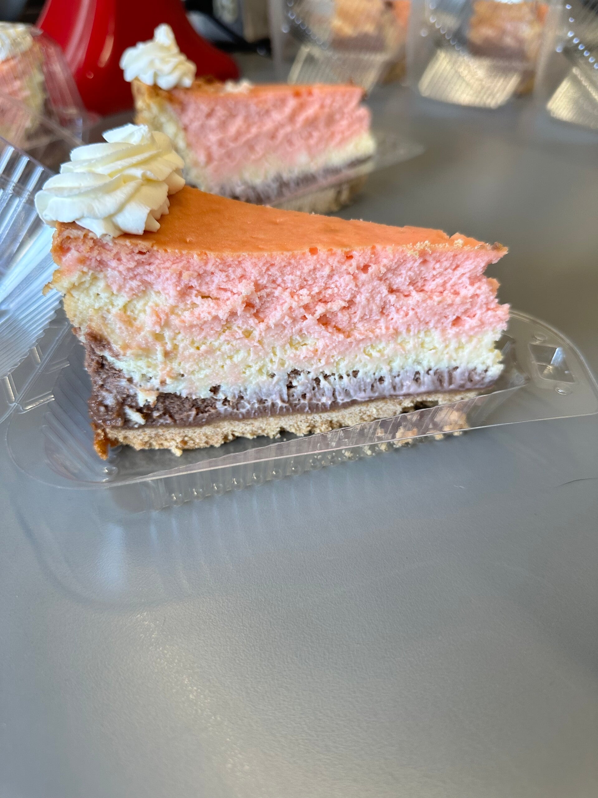 This layered cheesecake has all the flavors of Neapolitan ice cream. Chocolate layer, vanilla layer and a strawberry layer. Get all the flavors in one bite. Add whip cream if you would like.