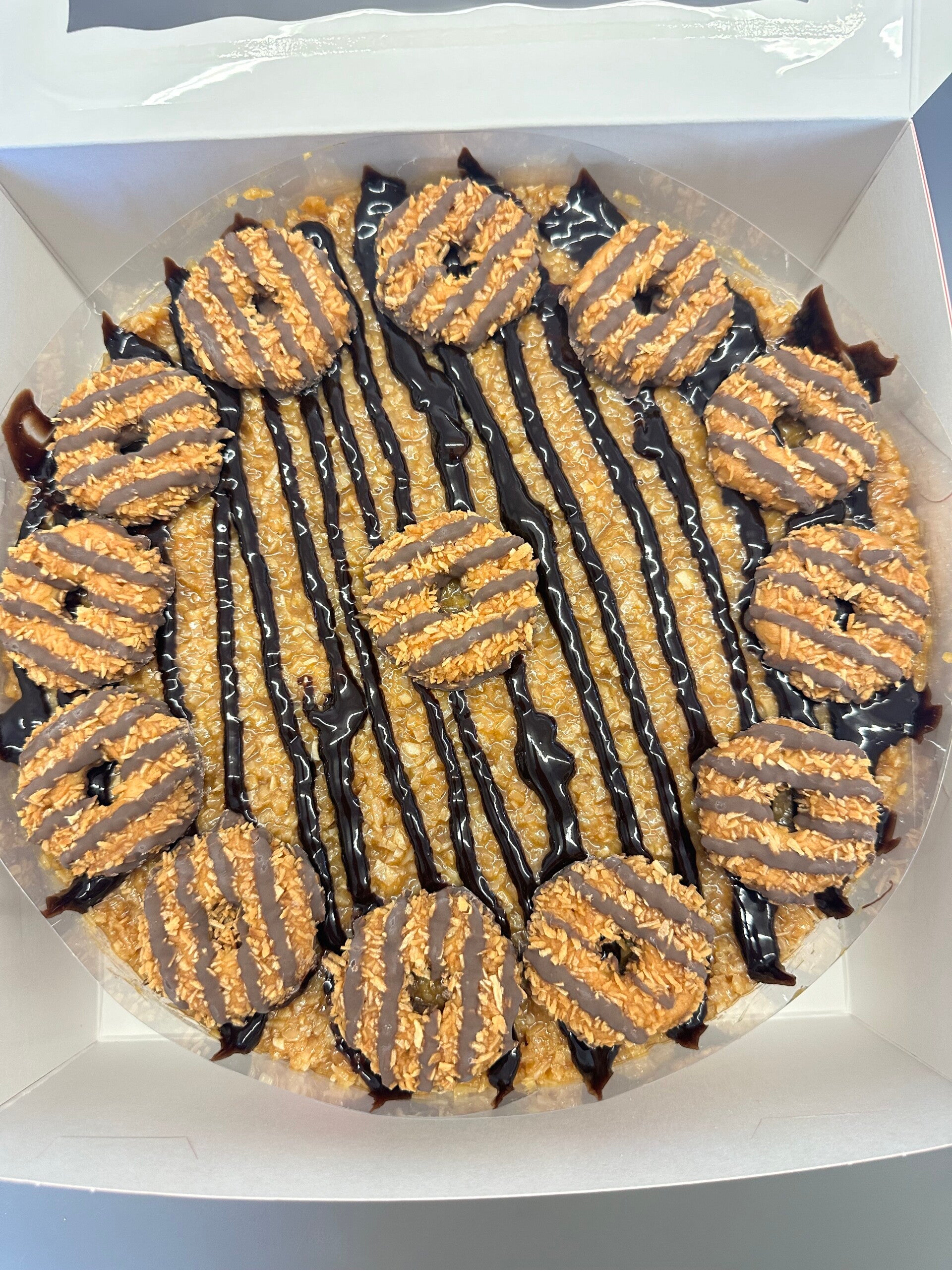 Note: this is a Girl Scout cookie inspired cheesecake. Cookies on top are only available during cookie season. Cheesecake can be ordered anytime.