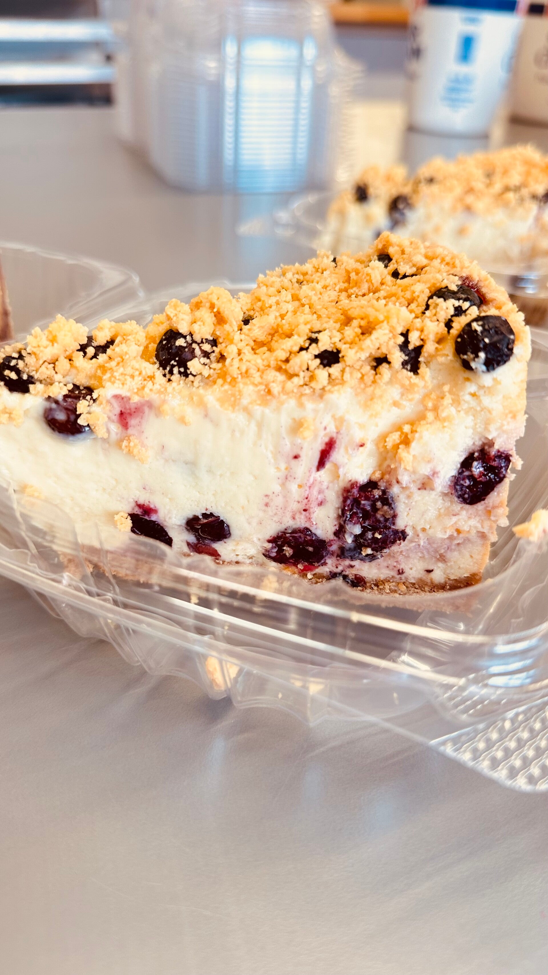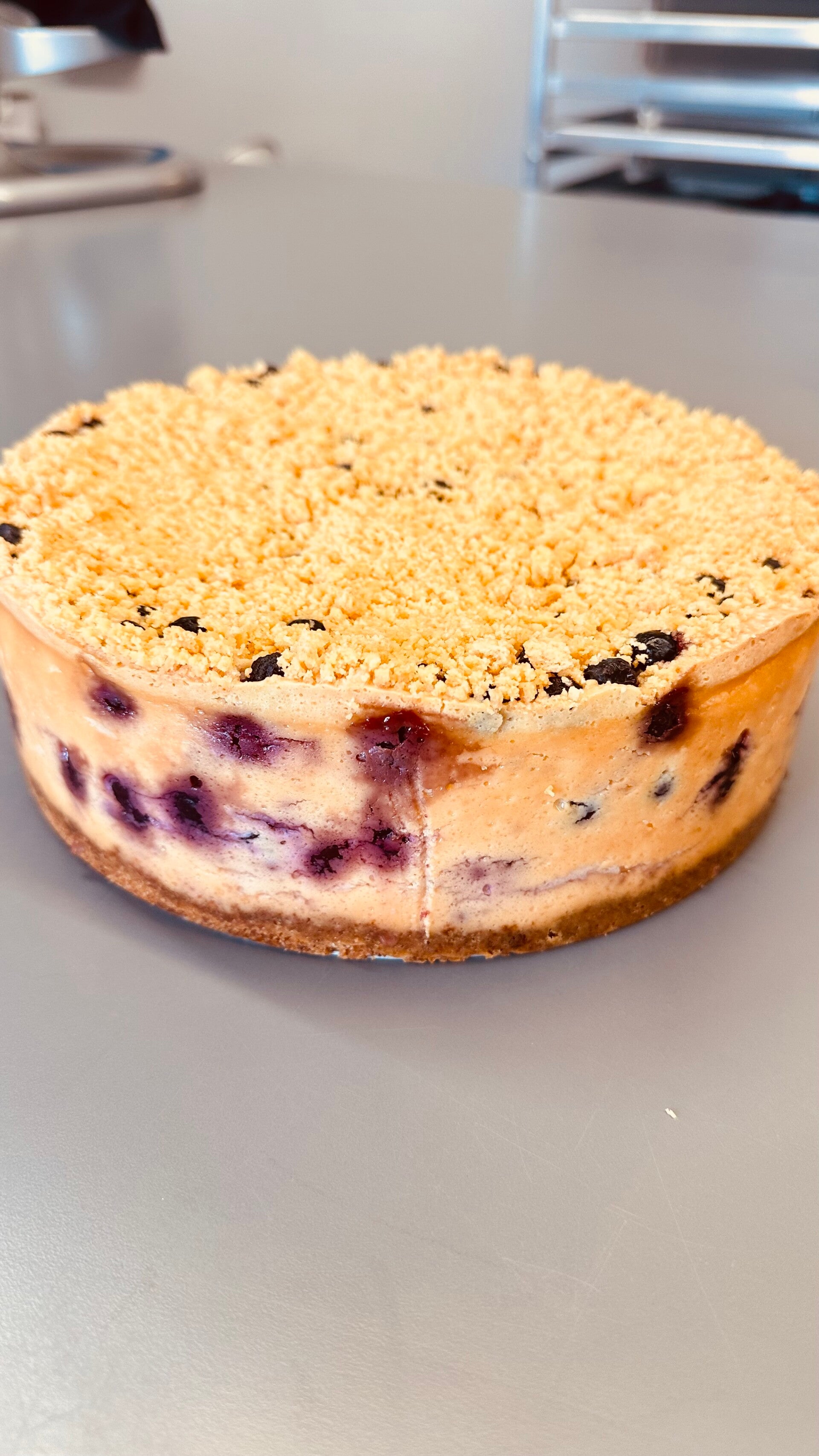The taste of summer in a delicious creamy cheesecake. This lemon flavored cheesecake is full of fresh blueberries throughout and on top with a lemon Oreo cookie crumble, baked to perfection.